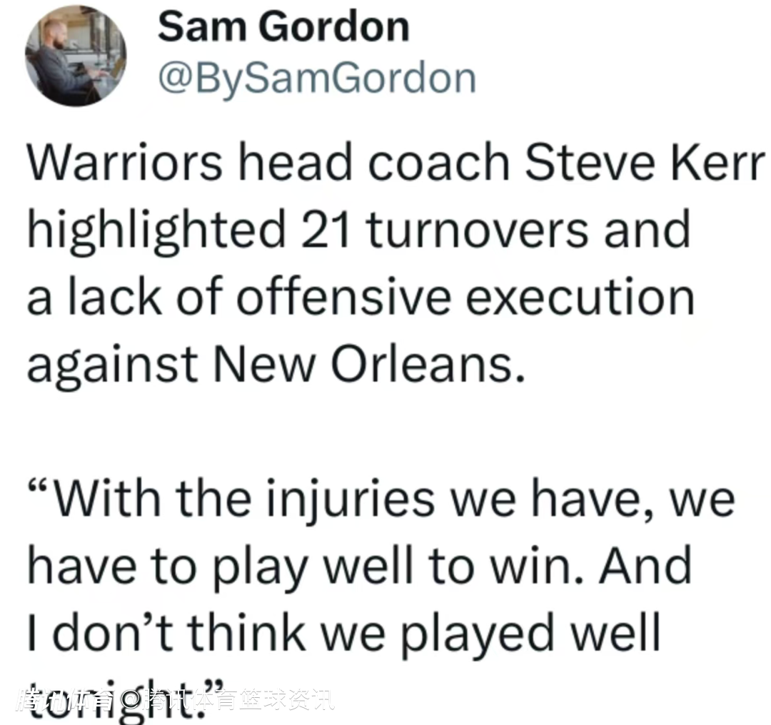科尔点名批评球队对阵鹈鹕一役出现21次失误,且进攻端执行力严重不足。“以我们目前的伤病情况,必须打出高水准才能赢球。而我认为,我们今晚打得并不好。”