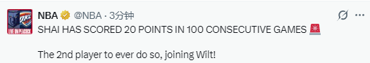 根据数据统计显示,这是亚历山大连续第100场比赛得分20+,目前他排在NBA历史第2位,距离打破张伯伦所保持的NBA连续20+历史纪录(126场),仅差27场比赛。
