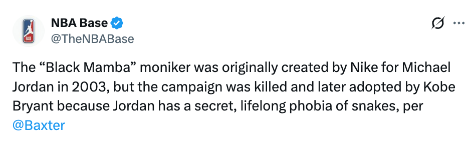 北京时间2月25日,据ESPN报道,“黑曼巴”这一绰号最初是耐克在2003年为迈克尔-乔丹打造的,但由于乔丹对蛇有着不为人知的终身恐惧,相关营销活动最终被取消,后来这一绰号才被科比沿用。