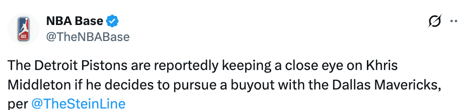 前不久,Stein就曾爆料,米德尔顿将自己决定是留在独行侠还是和球队协商买断,管理层已经向米德尔顿表示,如果他留队,下赛季可能在球队轮换阵容中有一席之地。本赛季是米德尔顿合同最后一年,薪水为3330万。