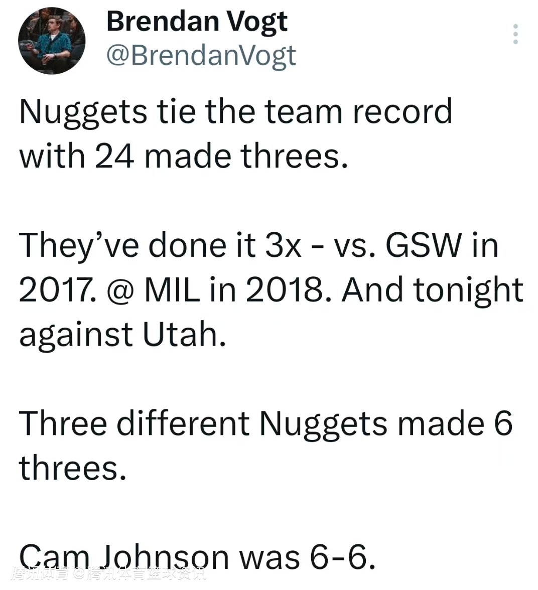 根据数据统计显示,本场命中24记三分,追平了掘金队史单场比赛三分命中数的记录。此前球队在2017年对阵勇士,2018年客场对阵雄鹿时均命中24记三分。