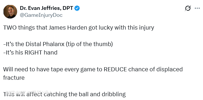 医学专家Jeffries表示:哈登这次受伤有两点比较幸运:1.只是拇指末端的远端指骨受伤,2.受伤的是右手(非投篮手)。后续每场比赛都需要缠胶布固定,降低发生移位骨折的风险。这会影响他接球和运球。