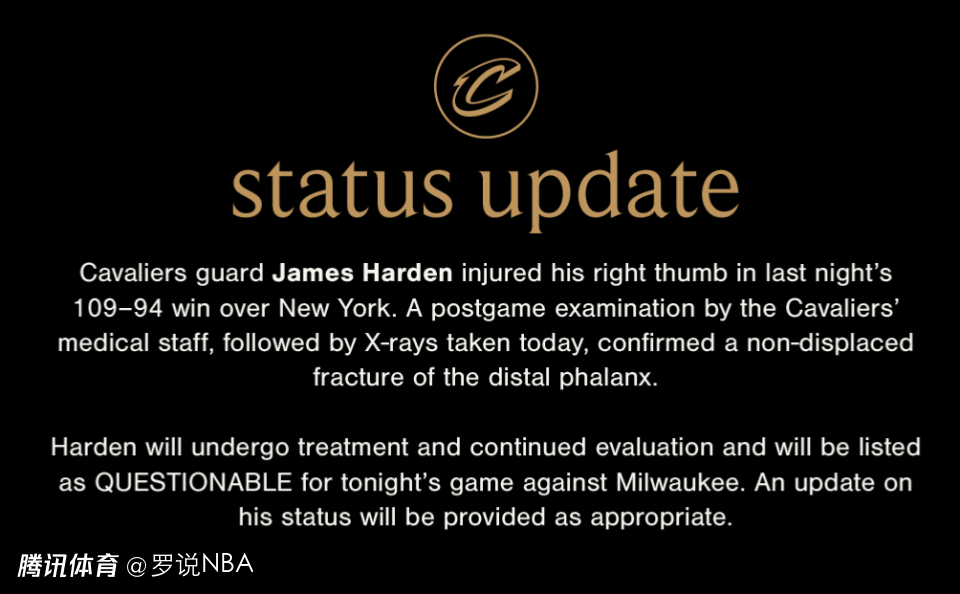 哈登第一时间并未直接被排除参加今天的比赛,这意味着此次伤情大概率不需要长期休战。不过最终仍需根据治疗方案确定,骑士方面称会适时更新这位明星后卫的状态。