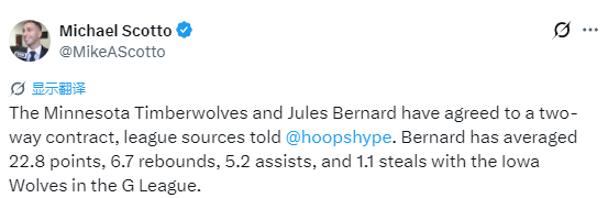 北京时间2月26日,据记者Michael Scotto报道,联盟消息人士向HoopsHype透露,明尼苏达森林狼队与朱尔斯-伯纳德签下一份双向合同。