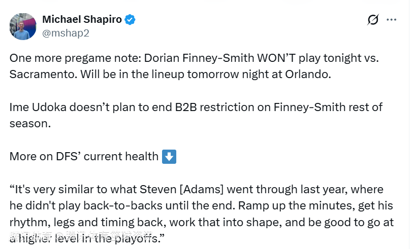 乌度卡还表示,芬尼-史密斯今晚缺阵,明天可以出战。本赛季剩余时间里,不打算取消芬尼-史密斯的背靠背轮休限制。“这和去年亚当斯的情况非常相似——他直到赛季末才打背靠背。我们会慢慢提升他的出场时间,帮他找回节奏、体能和比赛感觉,让他恢复状态,以便在季后赛里以更高水平出战。”他同时希望阿门-汤普森只缺阵一场比赛。