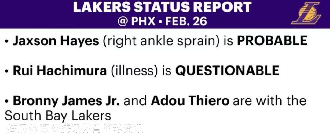 北京时间2月26日,NBA常规赛继续进行,湖人明日对阵太阳。赛前,湖人官方公布本场比赛伤情报告。上场缺阵的海斯大概率出战。