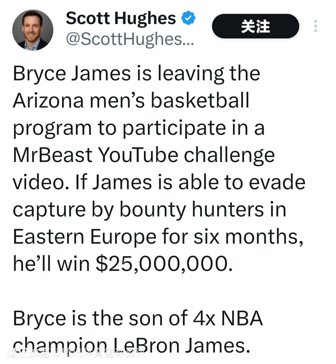 北京时间2月26日,据记者Scott Hughes报道,詹姆斯小儿子布莱斯-詹姆斯将退出亚利桑那大学男篮,去参加Mr Beast(野兽先生)的YouTube挑战视频。如果他能在东欧躲避赏金猎人的追捕长达6个月,就将赢2500万美元奖金。