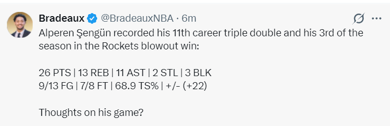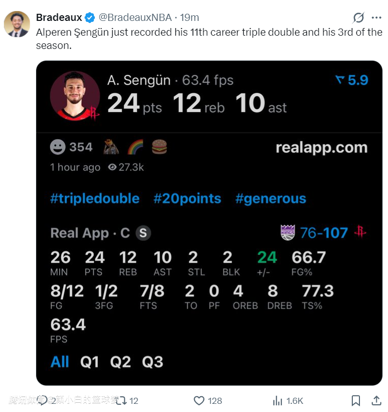 第三节申京仅打8分钟后他已经完成了三双数据,这时候火箭也领先国王达到30+,申京12投8中斩获24分12篮板10助攻2抢断2盖帽的顶级三双数据。