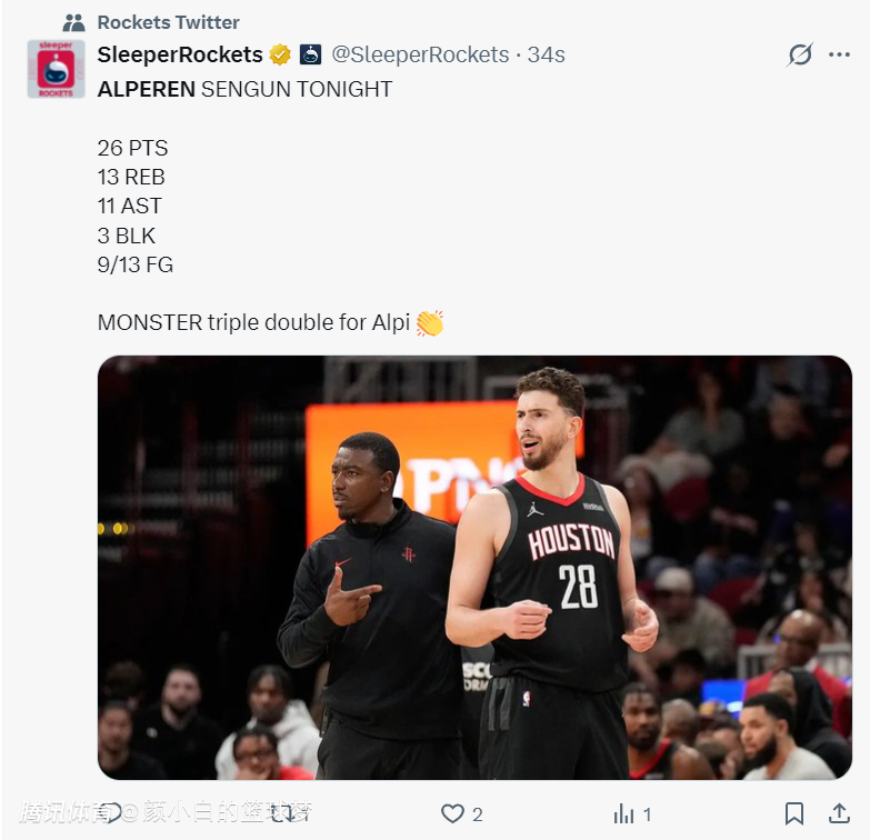 休媒晒出申京此役的数据,盛赞此役他拿到了怪物一般的三双数据。本赛季申京场均6.3助攻实际是火箭的第一组织进攻点,他继续朝着约基奇的方向进发。