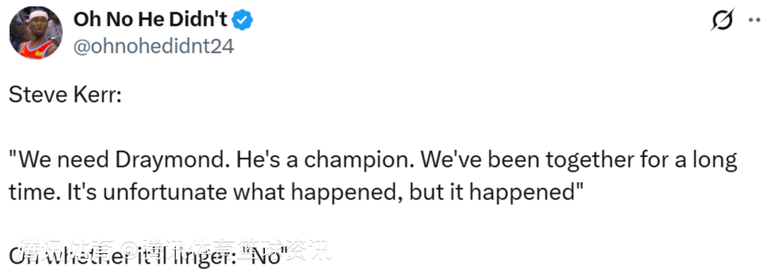我们需要追梦,他是冠军级的球员,我们合作这么多年了。我们能做的就是,团队剩下的人继续前进,持续进步。我认为这是我们打得比较好的比赛之一,我认为追梦打得非常好,整个团队都非常棒,但我们三分球在上半场18中3,就是投不进,但是比赛的过程很棒,并且延续到了下半场。是的,发生的事情很不幸,但已经发生了。”被问及这件事是否会影响球队氛围时,科尔回应:“不会。”