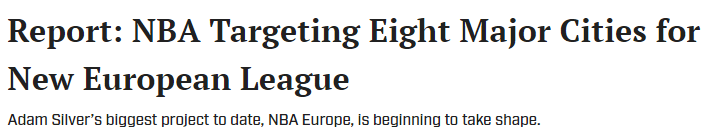 据CNBC记者报道,NBA已锁定8个欧洲城市作为欧洲联赛的常驻球队所在地:伦敦、巴黎、罗马、马德里、巴塞罗那、雅典、伊斯坦布尔、柏林。
