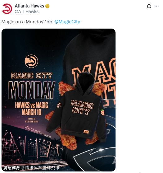 北京时间2月27日,老鹰队官方宣布,将在3月17日对阵魔术的比赛中,与当地知名的Magic City展开特别联名合作,这家夜店也被称作亚特兰大的标志性文化地标,向来是各界知名人士的打卡地。