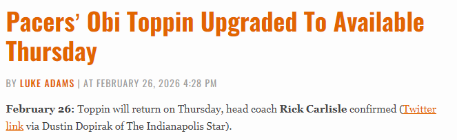 北京时间2月27日,NBA常规赛继续进行,步行者对阵黄蜂。赛前,步行者主帅卡莱尔确认,奥比-托平将在本场比赛复出。