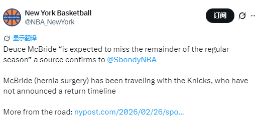 尽管麦克布莱德仍随队出行,但尼克斯尚未公布他的复出时间表。这一消息也印证了外界自2月初接受手术以来的担忧。