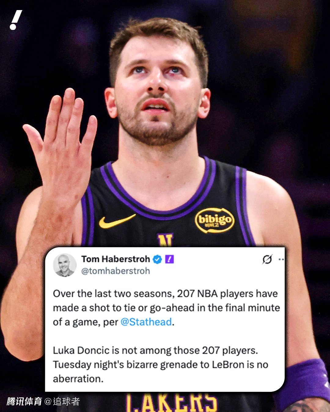 谈到东契奇生死时刻拒投三分,数据专家Tom Haberstroh发推写道:在过去的两个赛季中,据统计有207名NBA球员在比赛的最后一分钟投进了扳平或反超比分的关键球。卢卡·东契奇并不在这207名球员之列。周二晚上他对勒布朗的奇怪传球并非偶然。