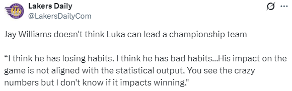 前NBA球员杰伊-威廉姆斯认为卢卡无法带领球队赢得冠军;他表示:我认为卢卡是我见过的最有天赋的球员之一,但他有一些失败的习惯,我认为他有一些坏习惯。他对比赛的影响力与他的数据并不相符。你会看到他惊人的数据,但我不知道这是否真的能帮助球队赢球……有时候,你会看到他每回合都冲着裁判大喊大叫,甚至在防守端都不愿回位,我真的怀疑他是否能成为大家期待的那种领袖,我认为他有一些坏习惯。