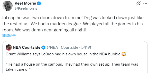 对于格威的言论,前湖人球员马基夫-莫里斯发推辟谣,大莫写道:笑死,这纯属瞎扯!他当时就住在我隔壁两扇门的房间!那家伙跟我们其他人一样,都被严格管控在园区里。我们当时搞了个麦登橄榄球游戏比赛,所有比赛都在他房间里打,我们几乎通宵打游戏!