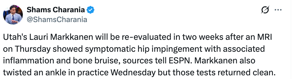 北京时间2月27日,据名记Shams报道,在当地时间周四接受核磁共振检查后,爵士球员马尔卡宁被确诊为髋关节撞击症伴随炎症与骨挫伤,将在两周后重新评估伤情。另外,马尔卡宁在周三训练中还扭伤了脚踝,但相关检查结果显示无结构性损伤。