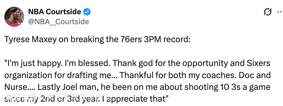 谈及自己超越艾弗森,成为队史三分球命中数最多球员,马克西表示:“我只是感到开心,也很感恩。感谢上帝给我这个机会,也感谢76人队选中了我。感谢我的两任主教练,道格-里弗斯和尼克-纳斯。哈里斯在我的新秀赛季就一直鼓励我,让我相信自己是个出色的射手,恩比德从我的第二、第三个赛季开始,就一直督促我每场投10个三分,我很感激他。”