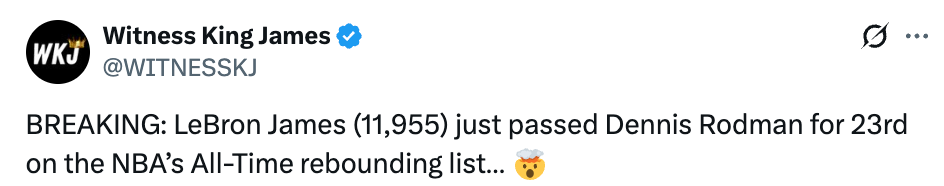 另外,他的总篮板数(11955个)超越罗德曼(11954个),升至历史第23位,接下来,他将追赶查尔斯-奥克利(12205个)。