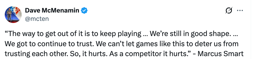“走出困境的方法就是继续比赛,我们的形势仍然不错,我们必须继续彼此信任。我们不能让这样的比赛阻碍我们相互信任。所以,这很伤人,作为一名竞争者,这确实很伤人。”