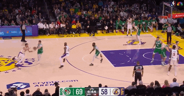比如这个回合,詹姆斯给东契奇掩护后接球策动后续进攻,助攻底角斯玛特三分命中。