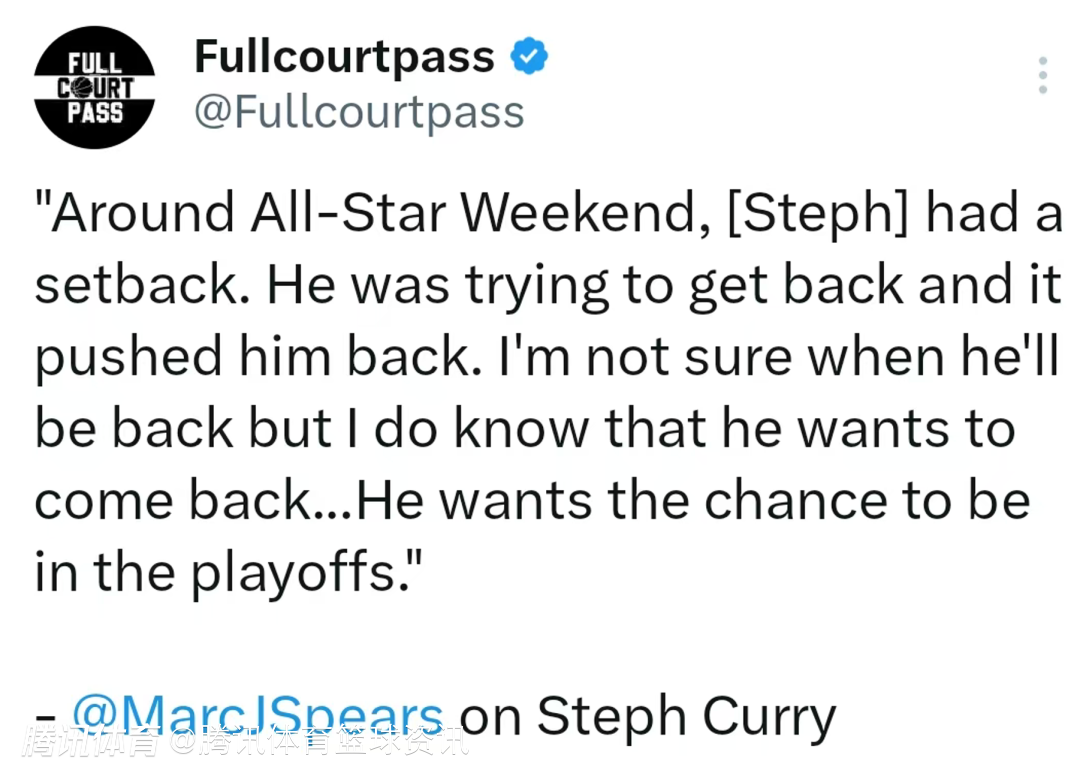斯皮尔斯表示:“库里本计划复出,但这次波折让他的归期再度延后。我不确定他具体何时能回归,但可以肯定的是,他渴望重返赛场,他希望能赶上季后赛。”