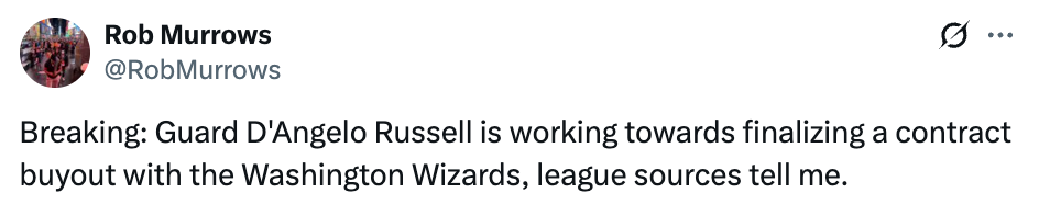 北京时间2月28日,据美记Rob Murrows报道,拉塞尔正在和奇才推进合同买断事宜。