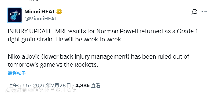 北京时间2月28日,热火官方更新球队伤情报告,鲍威尔核磁共振检查结果为右侧腹股沟一级拉伤,将列为每日观察名单。约维奇(腰背伤势管理)将缺席明日对阵火箭的比赛。