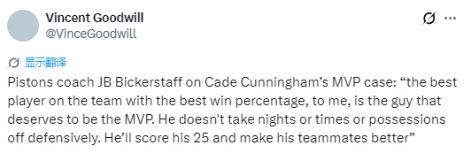 在谈到坎宁安的MVP竞争力时,比克斯塔夫说道:“在我看来,球队里最好的球员、同时带队打出最佳胜率的人,就配得上MVP。他在防守端从不会偷懒、不会松懈任何回合。他既能场均砍下25分,还能让队友变得更好。”