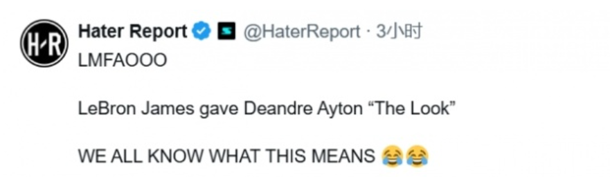 北京时间2月28日,美媒Hater Report更新动态,晒出詹姆斯给了德安德烈-艾顿一个经典死亡凝视(The Look)的画面,并点评道:“懂的都懂,这眼神里大有深意!”