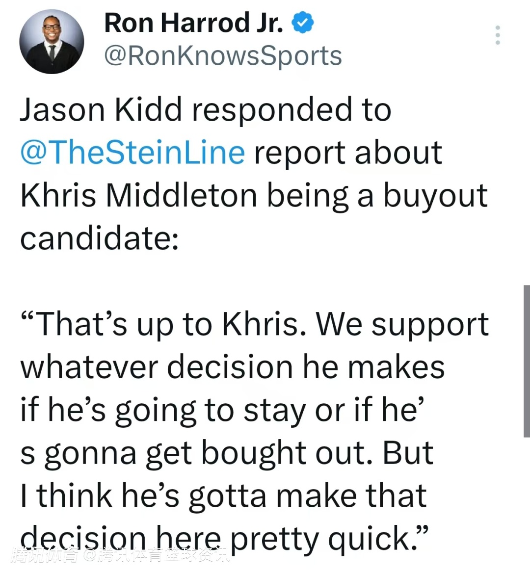 针对米德尔顿的买断传闻,基德也做出回应,他表示球队会尊重球员的所有决定:“这一切都由米德尔顿自己决定,无论他选择留下还是达成买断,我们都会支持。但他确实需要尽快做出决定了。”