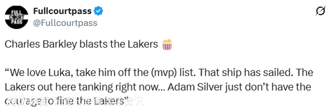 巴克利表示:“我们很喜欢东契奇,但把他从MVP候选名单里划掉吧,这事已经没戏了。湖人现在就是在摆烂,萧华根本没勇气罚湖人的款。”