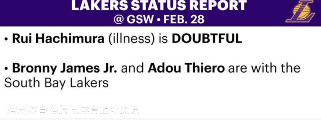 北京时间2月28日,湖人官方公布了明日对阵勇士的伤病报告,明天上午9点30分,湖人将客场对阵勇士。