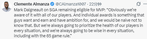 在谈到亚历山大仍有资格竞争MVP时,戴格诺特说道:“显然,我们和所有球员都清楚这件事。个人奖项是大家想要争取、也值得去追求的荣誉,我们不可能对此视而不见。但在任何情况下,我们都会把球员的健康放在首位,也会始终保持谨慎,包括应对65场比赛的出场规则。”