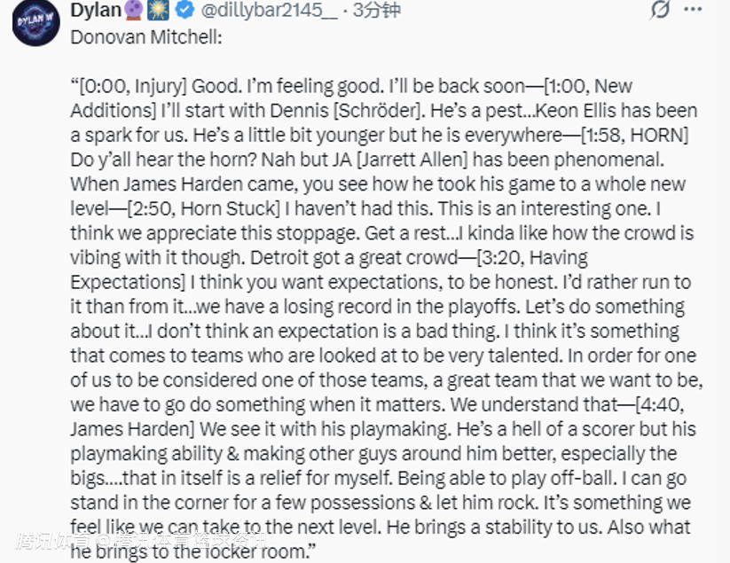 在谈到骑士队的新援时,米切尔说道:“施罗德真的很有活力。埃利斯也给我们带来了很大能量,他稍微年轻一点,但场上无处不在。我们都看到了哈登的组织能力,他是个极其出色的得分手,但他的传球组织、带动身边队友变得更好,尤其是带动内线球员,这本身就帮我减轻了很多压力。我可以打无球,甚至可以在底角待几个回合,让他来主导。这正是能把我们提升到更高水平的东西。他给我们带来了稳定性,还有他在更衣室里带来的东西也非常重要。”