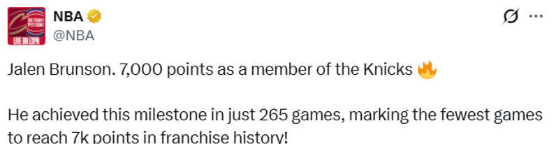 本场比赛之前,布伦森代表尼克斯队已经得到了6978分,而首节比赛,他就独得22分。其中在首节比赛的最后一攻,布伦森接到队友传球,突破后急停跳投得手,让自己完成了里程碑。