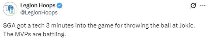 北京时间2月28日,NBA常规赛继续进行,掘金队对阵雷霆队。本场比赛,亚历山大迎来复出,而他在首节就与约基奇发生冲突,还因为用球砸对手而吃到了技术犯规。