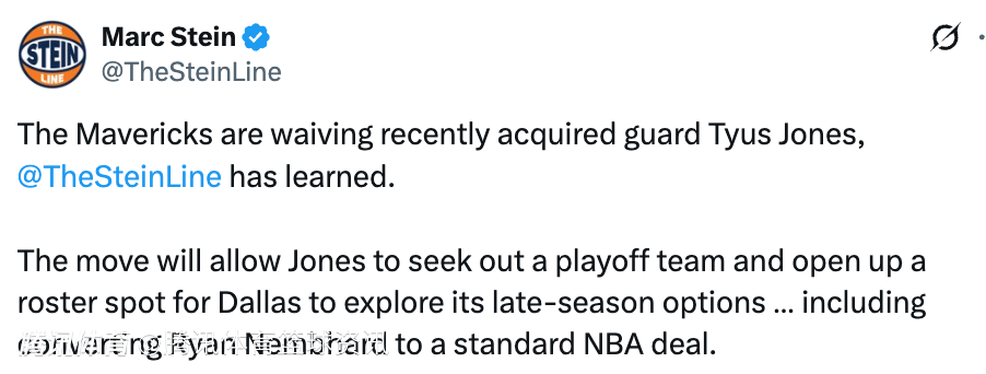 北京时间2月28日,据名记Stein报道,独行侠将裁掉泰鲁斯-琼斯。此举将让琼斯得以自由身寻找一支季后赛球队,同时为独行侠腾出一个阵容名额,用于探索赛季末的补强选择,其中就包括将瑞安-内姆哈德的合同转为一份标准NBA合同。