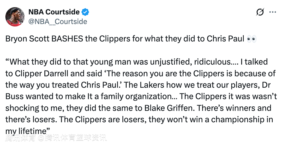 斯科特猛烈抨击快船队对待保罗的做法:“他们对保罗的所作所为毫无道理、荒谬至极,我跟克利珀-达雷尔(快船的超级球迷)说过‘你们之所以是快船,就是因为你们对待克里斯-保罗的方式’,湖人这边,老巴斯一直想把球队打造成一个大家庭,而快船的做法我一点都不意外,他们当初对布雷克-格里芬也是一样。有赢家就有输家。快船就是输家,在我有生之年他们不会赢得总冠军。”