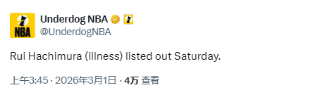 北京时间3月1日,NBA常规赛继续进行,湖人对阵勇士。赛前,湖人官方更新球队本场比赛伤情报告,八村垒因病缺席。