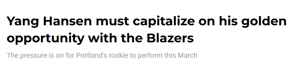 北京时间3月1日,开拓者93-109不敌黄蜂,目前29胜32负,排名西部第9。杨瀚森只获得最后2分15秒的垃圾时间,2中1得到2分1篮板。虽然他的上场时间依然很少,但波特兰媒体Rip City Project表示,杨瀚森得抓住3月的黄金机会。以下是文章内容——