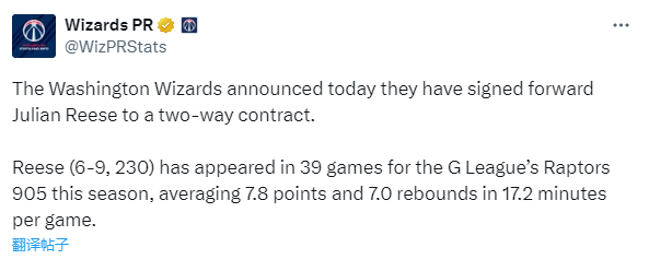 奇才此前将贾米尔-沃特金斯提拔为两年标准合同,因此腾出了一个双向合同名额。根据统计,里斯代表奇才最多可出战13 场常规赛。