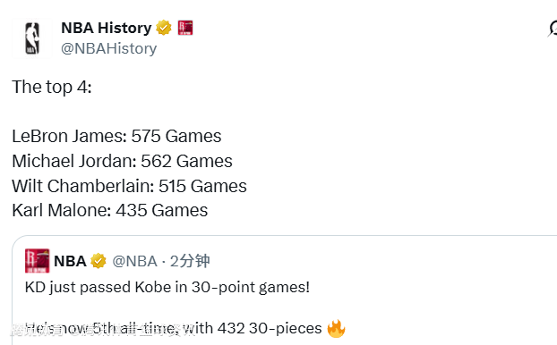 比赛进行到第四节时,杜兰特右侧下快攻,接球上篮得分后,本场得分突破30,30+场次正式超越科比,以432次30+位列历史第五。