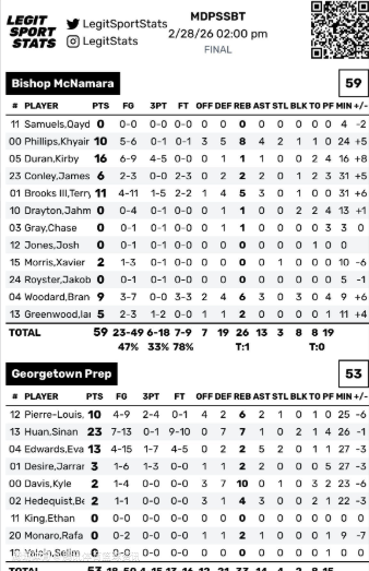 北京时间3月1日,马里兰州私立学校Division A锦标赛8强战继续进行,马里兰州乔治城预科高中以53-59不敌Bishop Mcnamara高中。