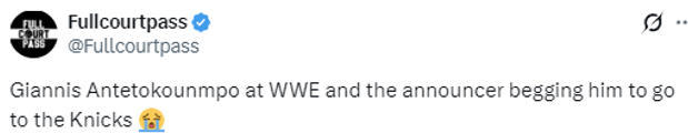 北京时间3月1日,雄鹿队当家球星扬尼斯-阿德托昆博(下文简称字母哥)现身WWE赛场,受到了现场观众的热情欢呼。而现场的解说员在对字母哥进行介绍之后,直接请求他加盟尼克斯。
