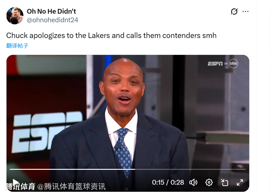而在此前,巴克利同样是在直播期间表示:“湖人根本算不上一支强队,而媒体如今把所有问题都归咎于东契奇,这一点在我看来实在可笑。什么都是东契奇的错,我觉得这事儿滑稽至极。湖人就是实力不行,他们运动能力不足,防守也糟糕。而且我猜,我们现在因为合约要求,每天都得像电视台那样围着他们报道——毕竟他们现在成了我们台的重点关注对象。”