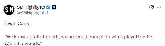 库里在谈到自己的伤病恢复情况时透露,自己在因伤缺阵以来,还未进行过任何场上训练,但他对于健康的勇士队依然充满信心。库里说道:“说实话,我们完全有实力在季后赛里击败任何对手,关键就在于我们能不能健健康康地打进季后赛?所以首要任务就是把所有人都凑齐,真正搞清楚我们这支球队到底是个什么水平,那才是最重要的。”