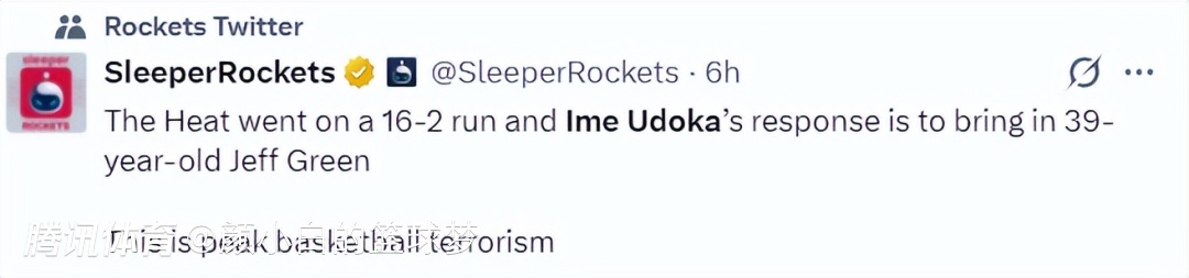 休媒也指责乌度卡,在热火打出那一波16-2的攻防浪潮后,乌度卡没有任何的调整,他只将39岁的杰夫-格林给换上。这简直就是恐怖主义的篮球巅峰。