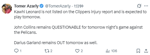 快船队在今早训练时表示,莱昂纳德因生病曾被列为出战成疑,但之后他没有出现在明天对阵新奥尔良鹈鹕队的伤病报告中,现在看来他可以出战。约翰-科林斯(头部裂伤、颈部酸痛)出战成疑,加兰(左脚趾伤势管理)缺席比赛。根据此前的报道,加兰有望在对阵勇士队的比赛中迎来快船生涯首秀。